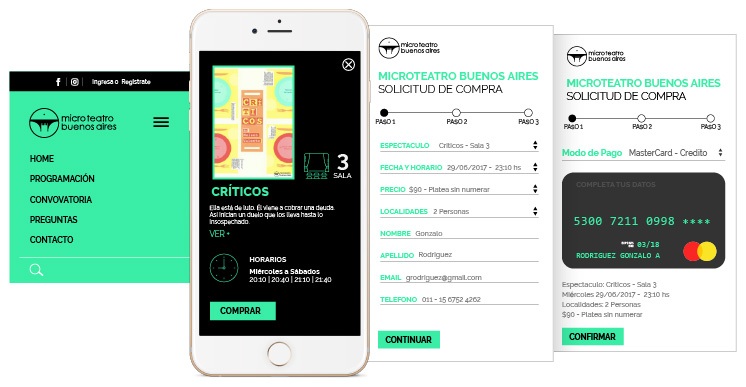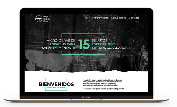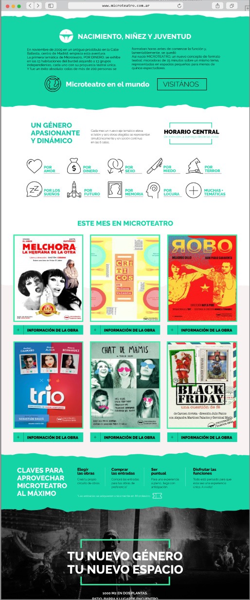 Para el diseño de la tienda online tomamos en cuenta la simpleza, donde podemos apreciar en la pantalla principal un resumen que muestra el concepto y funcionamiento de Microteatro. Se puede observar la cartelera del mes corriente y efectuar la compra directamente, facilitando la experiencia de usuario en la navegación del sitio.